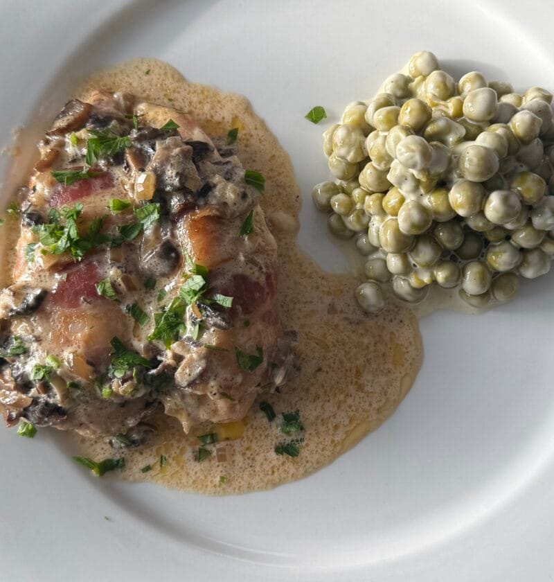 Bacon-wrapped chicken tenders with a creamy mushroom sauce