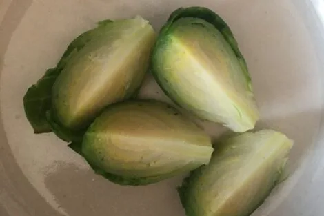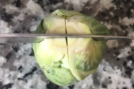 • After all the sprouts are cooled and drained, cut them in four pieces, using the precut marking (1/3 through). Set aside. This part of the process can be done even a day ahead of assembling the dish. Keep the sprouts covered in the fridge.