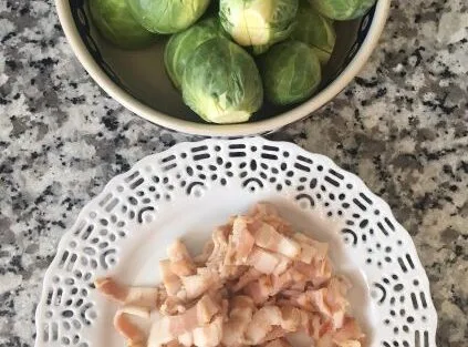 • When getting close to serving, saute precut bacon. When it looks crisped and almost done add brussels sprouts. Saute on high heat until all the sprouts get nicely browned on the cut sides. Serve immediately.