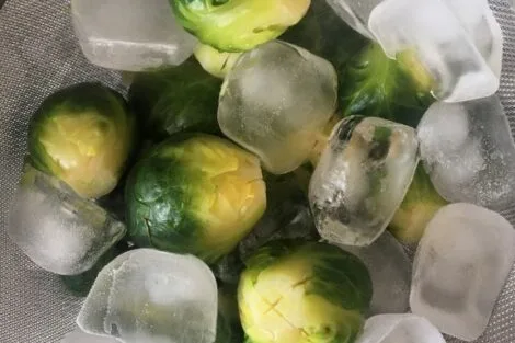 • Using a strainer, discard water. To keep the bright green color of the sprouts, cooking process needs to be stopped abruptly by putting ice cubes on top of the hot sprouts.